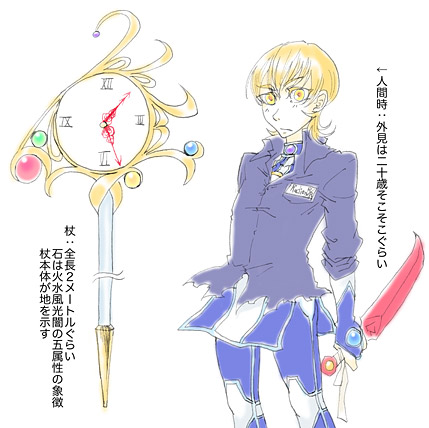 異世界の詩をモチーフにした杖で、コンセプトは「持ち主の潜在能力の発現・増幅を行いつつ、術の媒介としても鈍器としての使用にも耐えうる大型の杖」だった。が、後述の理由により現在は持ち主の魔力増幅と術の媒介しかできない。鈍器としては使える。